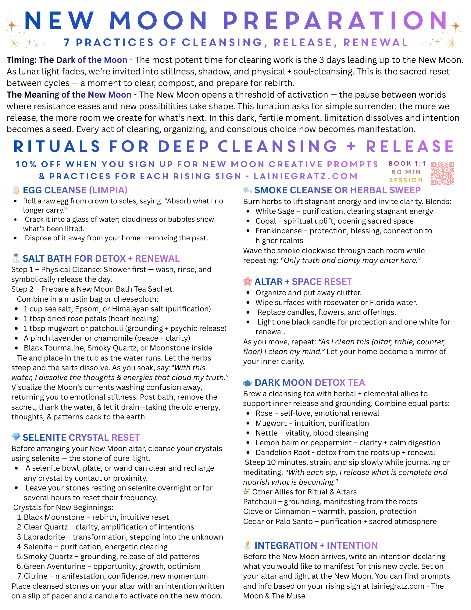 New Moon Preparation — This guide offers 7 practices for cleansing, release, and renewal during the most potent window of the lunar cycle. By working with the Dark of the Moon and the opening created by the New Moon, you clear what’s complete, soften resistance, and make space for new intentions to take root.