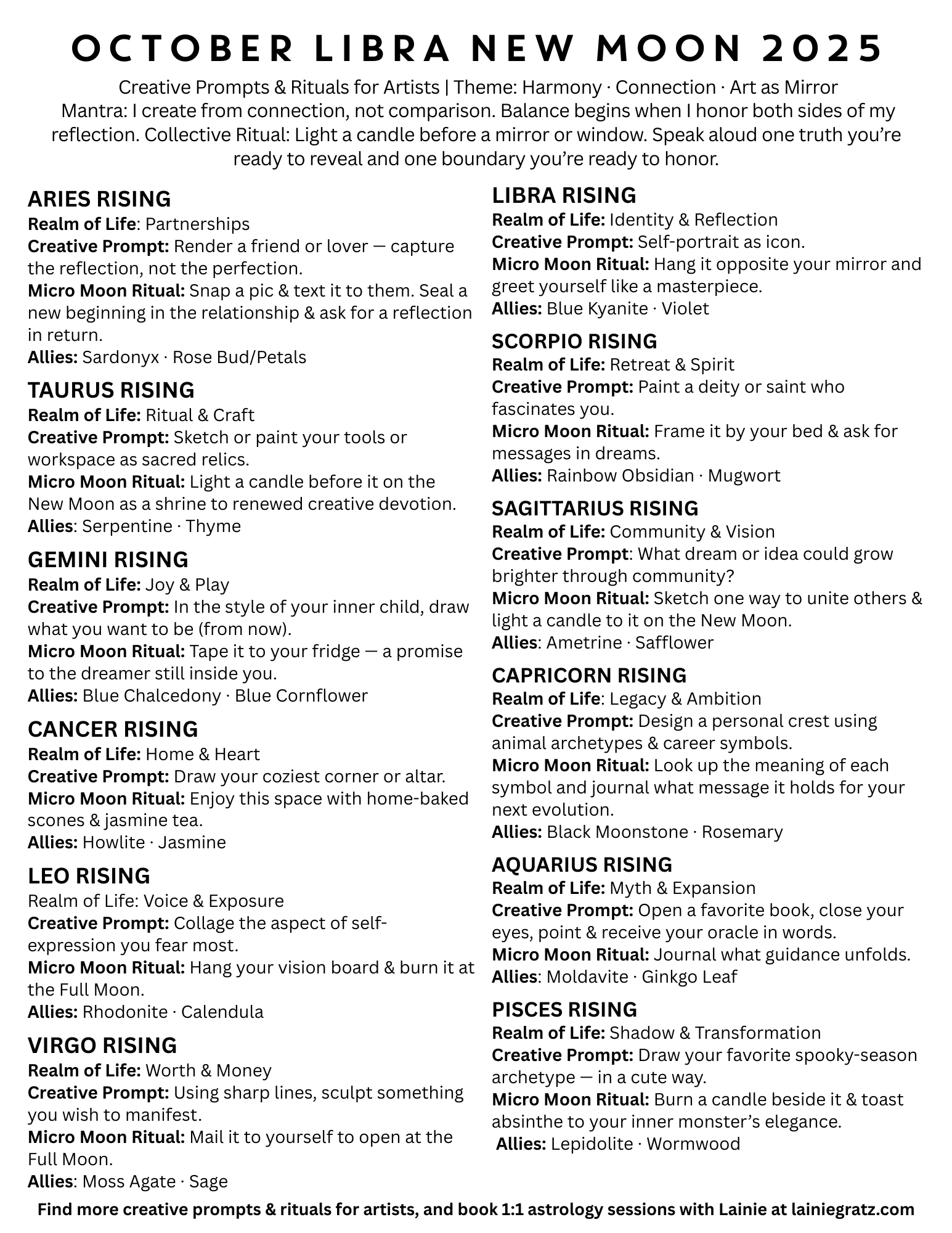 Looking for fresh inspiration? This New Moon guide blends astrology, art, and ritual to help you reconnect with your creative flow. Think of it as your lunar sketchbook โ filled with sign-based art prompts, intuitive rituals, and crystal / herbal allies.